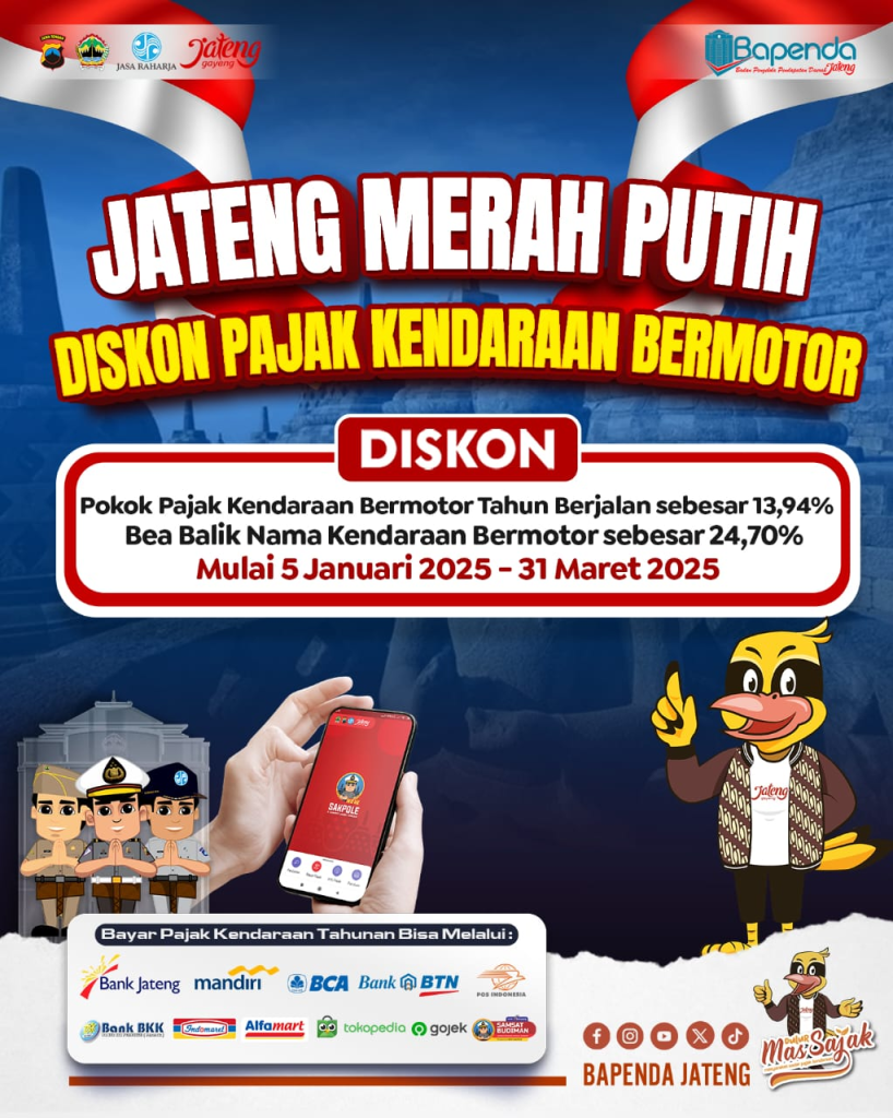 Mulai 5 Januari hingga 31 Maret 2025, para pemilik kendaraan di Kabupaten Sragen berkesempatan menikmati pengurangan pokok pajak kendaraan bermotor (PKB) sebesar 13,94 % dan pokok bea balik nama kendaraan bermotor (BBNKB) sebesar 24,70 %.