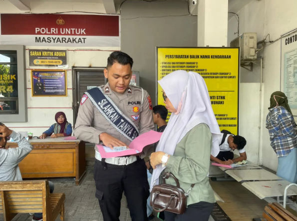 Terlihat dalam foto, seorang Polwan yang bertugas sebagai Duta Pelayanan SIM sedang memberikan flyer sosialisasi kepada pemohon di area loket pendaftaran. Dengan panduan ini, pemohon dapat memahami secara rinci tahapan SIM Perpanjangan yang meliputi: