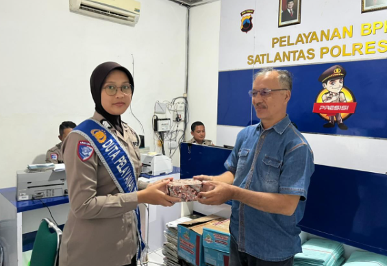 Sragen, Selasa 21 april 2026 – Jajaran Satuan Lalu Lintas (Satlantas) Dengan berbagai inovasi, Duta Pelayanan BPKB terus meningkatkan pelayanan publik yang modern, transparan, dan berorientasi pada kepuasan masyarakat, Dalam rangkaian program “Polantas Menyapa”, petugas Satlantas Polres Sragen kegiatan pemberian reward kepada pendaftar pertama berupa Souvenir kepada salah seorang di BPKB. Hal ini juga salah satu cara mempererat hubungan personel sat lantas polres sragen dengan masyarakat.