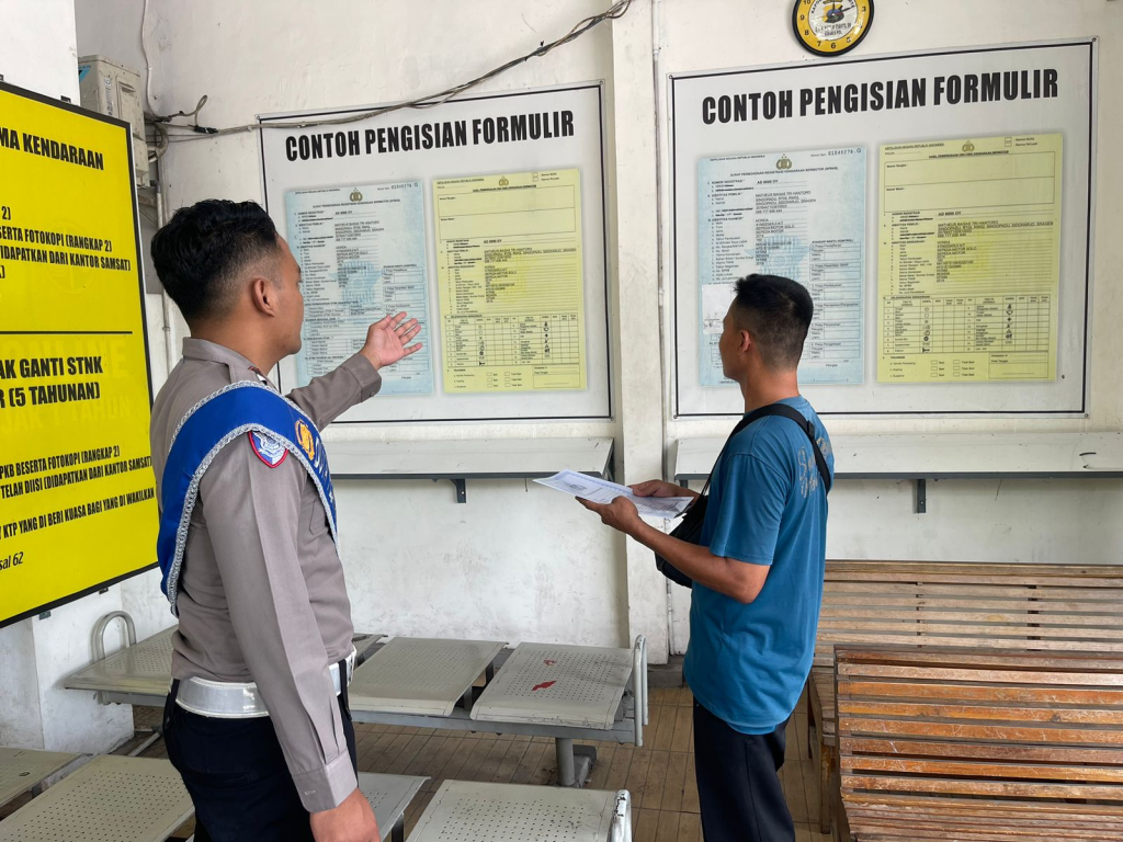 Rabu, 5 November 2025 – Satuan Lalu Lintas (Satlantas) Polres Sragen terus berinovasi dalam pelayanan Administrasi kendaraan bermotor di Sistem Administrasi Manunggal Satu Atap ( Samsat ). Melalui program humanis bertajuk “Polantas Menyapa”, petugas kepolisian aktif berinteraksi dengan masyarakat untuk memberikan edukasi dan sosialisasi standar pelayanan Samsat Sragen secara langsung.
