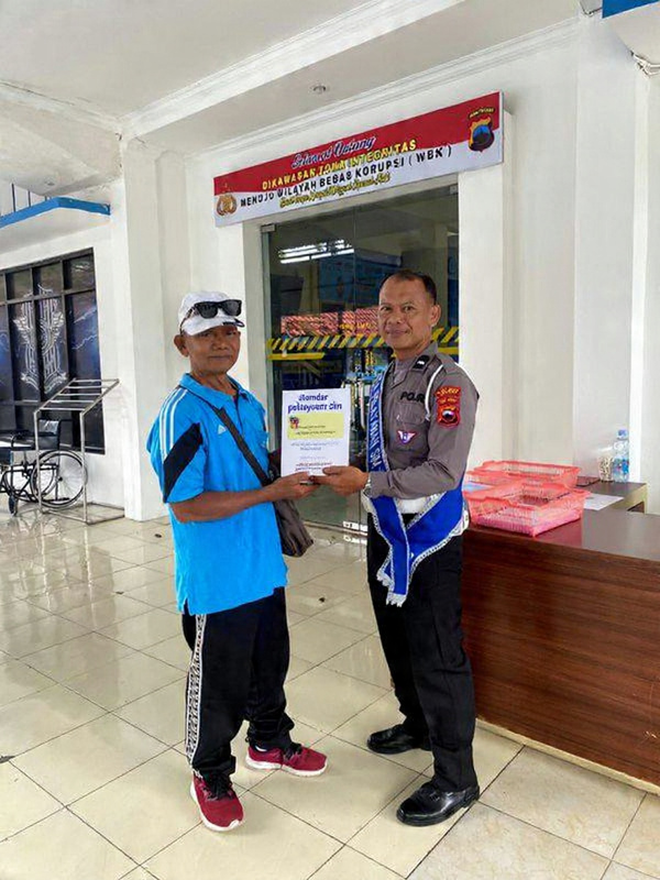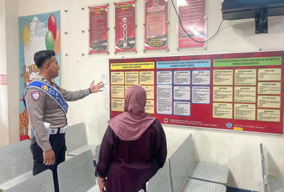 Seperti yang terlihat, salah satu anggota Polantas Polres Sragen terlihat sedang berinteraksi dengan seorang wajib pajak yang sedang menunggu antrean di area pelayanan publik. Dalam kesempatan tersebut, petugas secara proaktif menjelaskan berbagai informasi penting seputar prosedur pengurusan administrasi kendaraan yang sedang dijalani wajib pajak tersebut dengan menggunakan media flyer / papan informasi yang mudah dipahami.