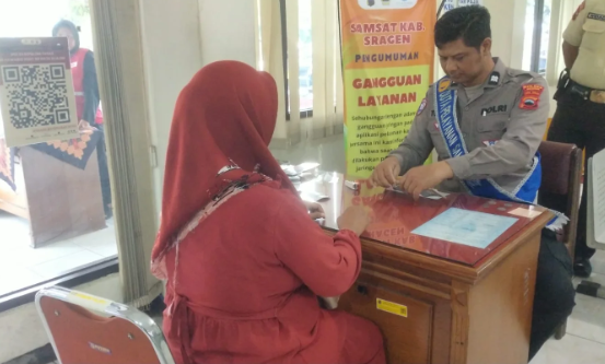 Seperti yang terlihat, salah satu anggota Polantas Polres Sragen terlihat sedang berinteraksi dengan seorang wajib pajak yang sedang menunggu antrean di area pelayanan publik. Dalam kesempatan tersebut, petugas secara proaktif menjelaskan berbagai informasi penting seputar prosedur pengurusan administrasi kendaraan yang sedang dijalani wajib pajak tersebut dengan menggunakan media flyer / papan informasi yang mudah dipahami.