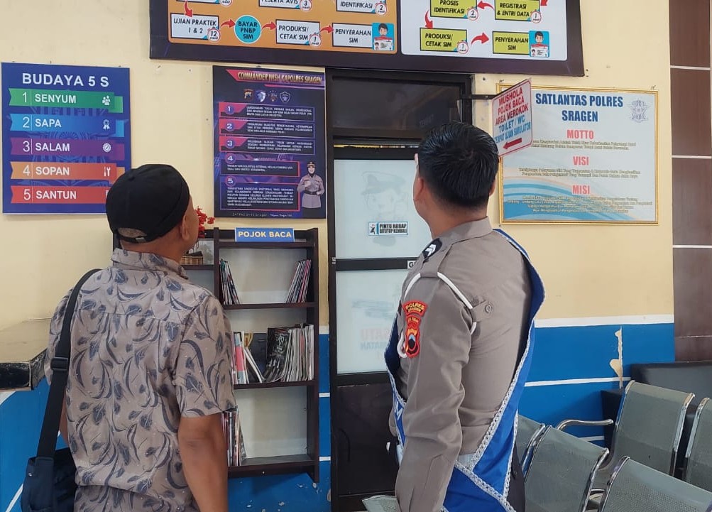 Komitmen untuk menghadirkan pelayanan publik yang bersih, transparan, dan akuntabel terus diperkuat oleh Satuan Lalu Lintas (Satlantas) Polres Sragen. Melalui personel Duta Pelayanan SIM, aksi sosialisasi intensif kini gencar dilakukan di area Gedung Satpas Polres Sragen dengan memanfaatkan media flyer dan banner informasi.