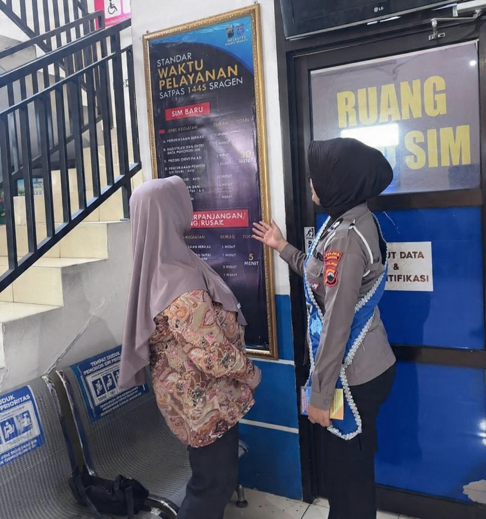 SRAGEN – Dalam rangka mewujudkan pelayanan publik yang transparan dan akuntabel, Satuan Lalu Lintas (Satlantas) Polres Sragen menggelar kegiatan “Polantas Menyapa” di lingkungan Satpas 1445 Sragen. Kegiatan ini melibatkan sosok Duta Pelayanan yang bertugas menyapa langsung para pemohon SIM untuk memberikan sosialisasi mengenai standar pelayanan melalui pembagian flyer informatif.
