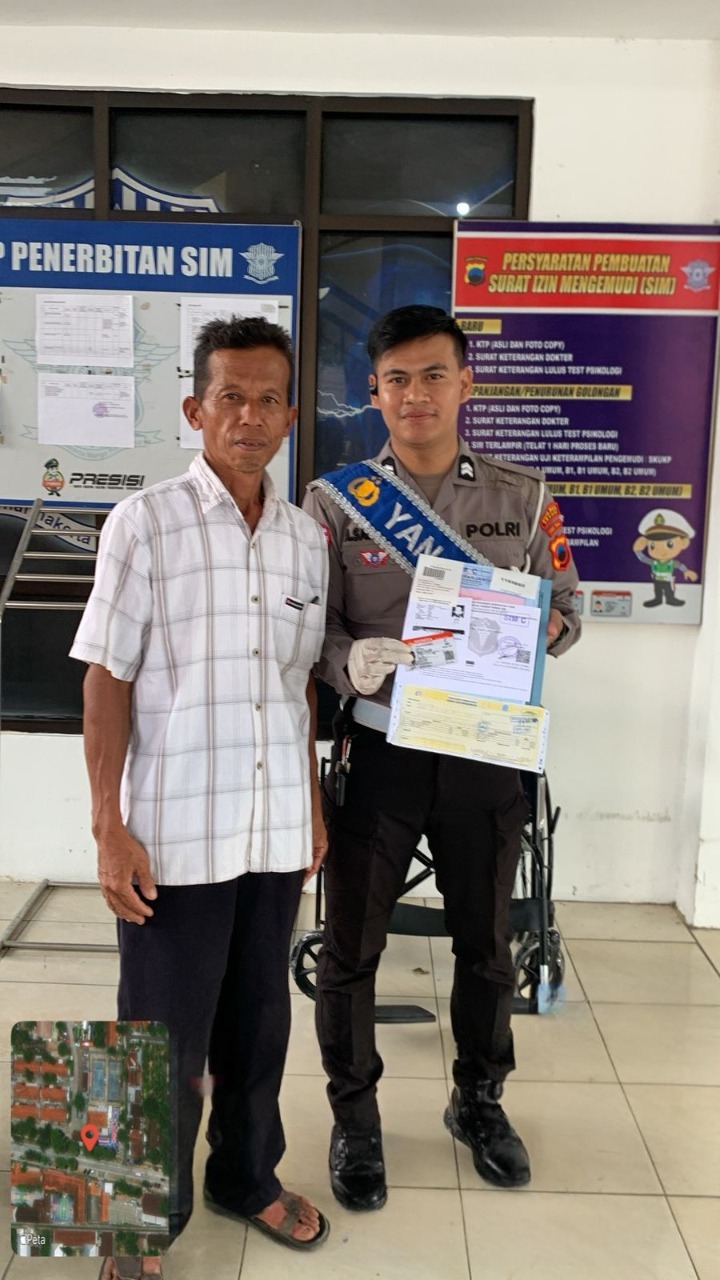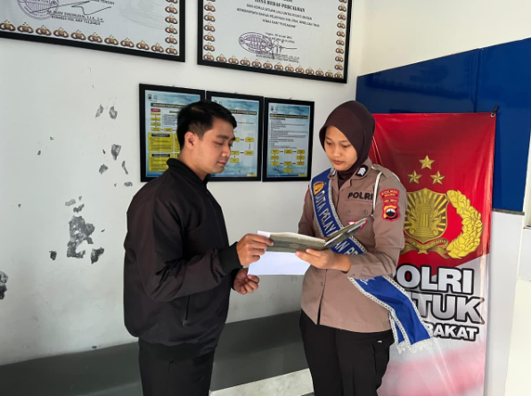 Terlihat dalam foto, seorang petugas Duta Pelayanan SIM berdiri di samping papan persyaratan, secara intensif membantu pemohon SIM untuk memeriksa dan merapikan dokumen-dokumen krusial (seperti surat keterangan dokter dan psikologi) yang menjadi syarat utama penerbitan SIM.